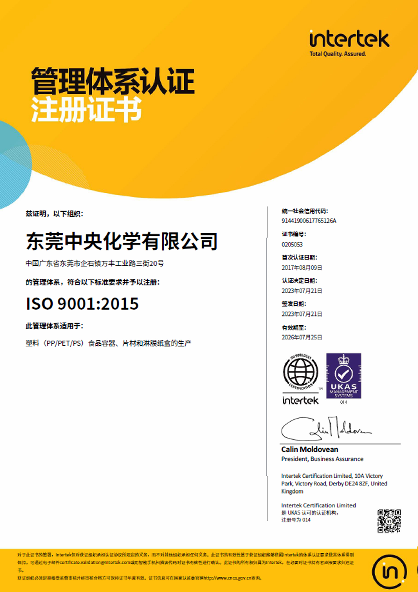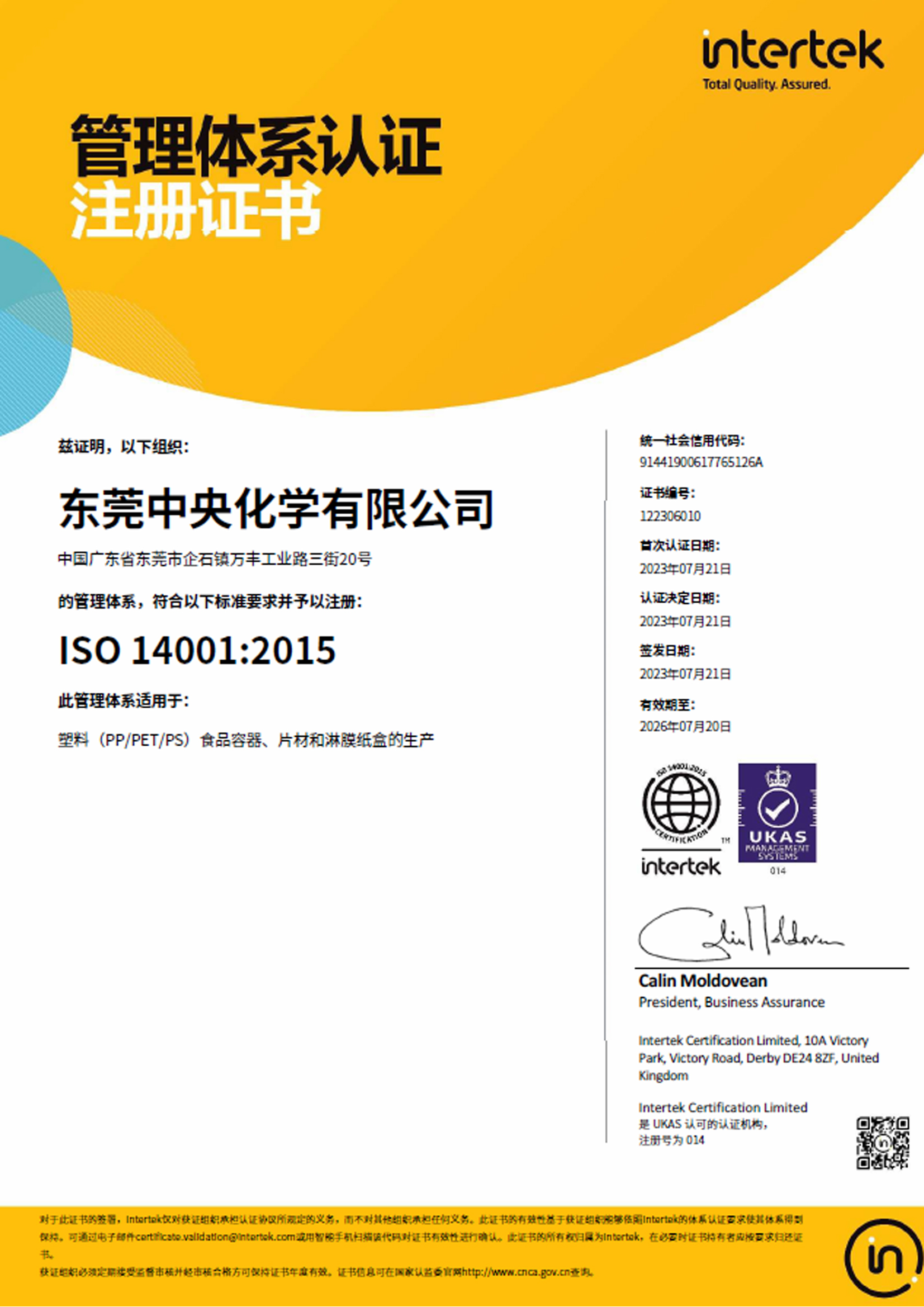 公 司 名 称 : 东莞中央化学有限公司